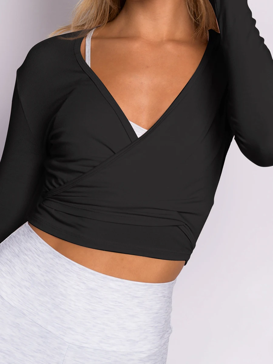 Style: Ballet wrap-style long sleeve workout top Neckline: V-neck wrap front Sleeves: Long sleeves Fit Feature: Fitted, flexible silhouette Use: Yoga, pilates, dance, studio workouts, casual activewear |